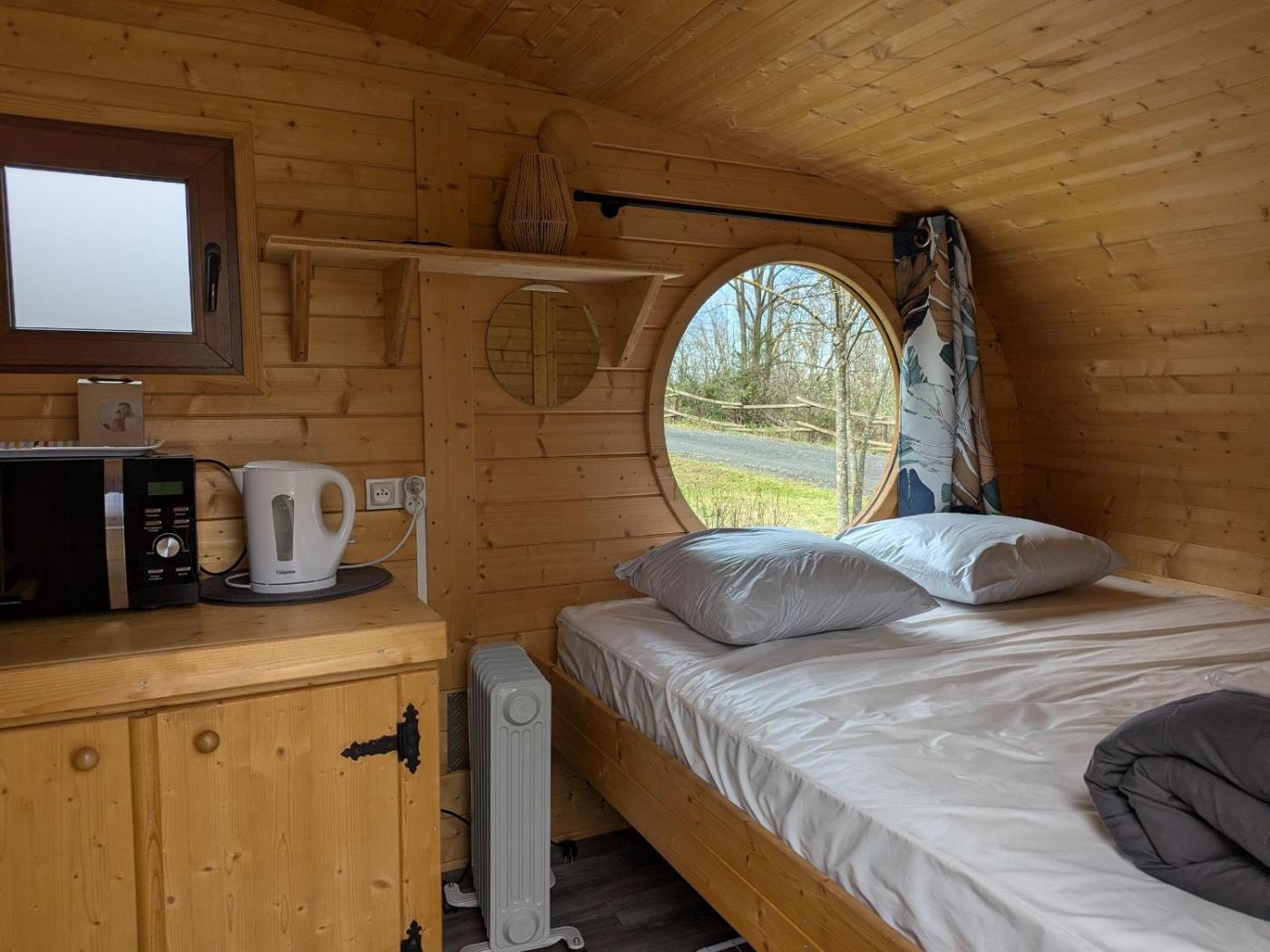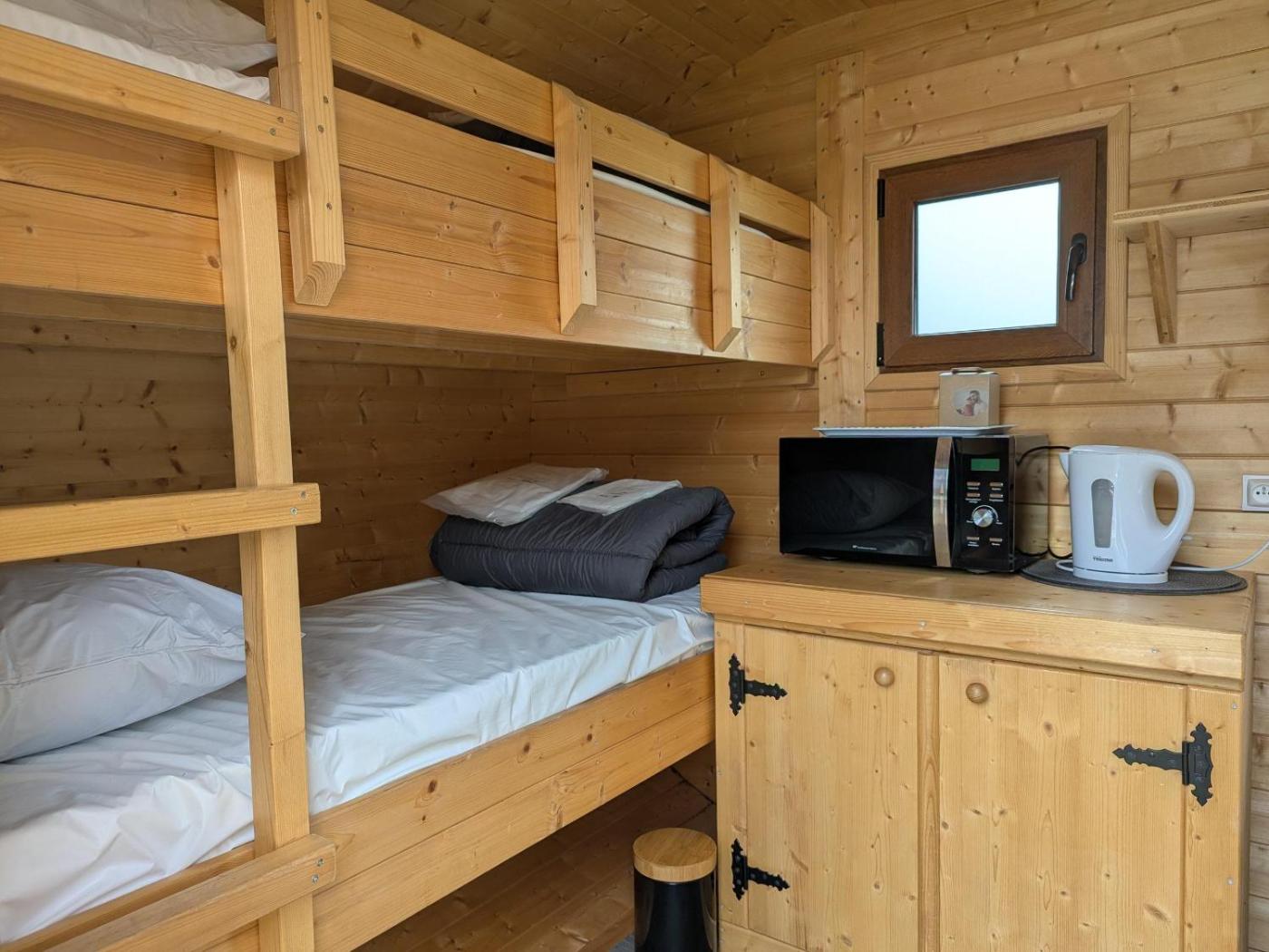 Capsule Écologique. The Ecopod does not have sanitary facilities or a water point (sanitary facilities nearby) and does not have a refrigerator but can be connected to an electric cooler. This accommodation has accessible storage space under the bed. 1 double bed 1.60 by 190 cm, 2 single bunk beds 90 x 190 cm Equipment: crockery, microwave, kettle, garden furniture and reversible air conditioning. The rooms measure 12 m². We draw your attention to the fact that the accommodation is quite small, and we only recommend very small dogs. So that we welcome you in the best conditions, do not hesitate to let us know that you are coming with your pet. ;