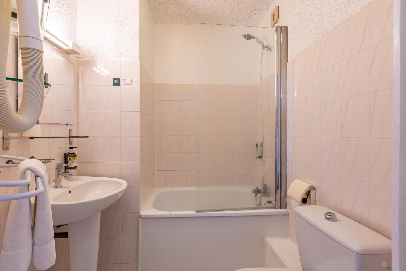 Chambre Triple. Bâtiment avec uniquement des hébergements - La réception et le restaurant se situent au Logis Le Cours, à 300 mètres, au 10 avenue Francois Griffeuille 30800 St Gilles. Toutes les clés doivent être récupérées au Logis Le Cours. Cette chambre de 14 m² climatisée comprend 1 lit de 140 cm et 1 lit de 80 cm ou 3 lits de 80 cm et une télévision à écran plat. La salle de bains est pourvue dune douche ou dune baignoire, de toilettes et dun sèche-cheveux. Une connexion Wi-Fi est disponible gratuitement.